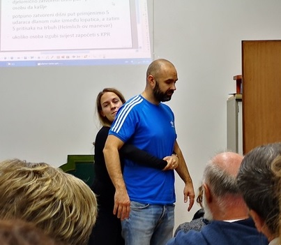 Vježbu je izuzetno kvalitetno vodila dr.med. Valerija Jurasić. Ukratko nas je podsjetila na način pristupa unesrećenoj osobi, pregleda vitalnih znakova, postupcima reanimacije, te imobilizacije.